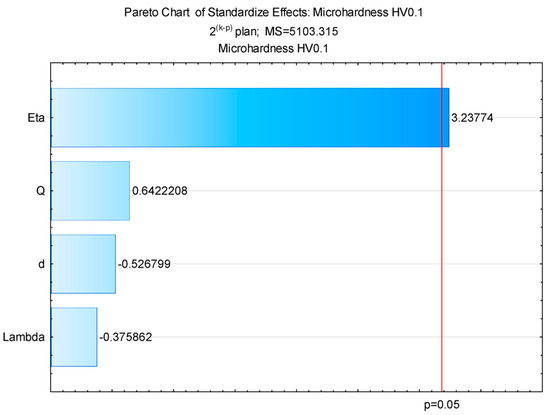 In the examined microhardness area, it was 863 ± 21 and 899 ± 25 for samples with Fe3O4 admixtures of 5 wt.% and 15 wt.%, respectively. The difference in microhardness values is not statistically significant. Similarly to the friction coefficient, the obtained microhardness results were subjected to ANOVA. The analysis showed no dominant influence of any input parameter on the examined microhardness. Only the parameter η (Eta) from the group of input parameters has the greatest influence on microhardness. For each investigated input parameter, the function F took values below 1, and the parameter p took values exceeding 0.7, confirming the lack of statistically significant influence of any of the input parameters. A graphical presentation of the contribution of individual factors to the hardness of the coating is presented in a Pareto diagram (Figure 13).