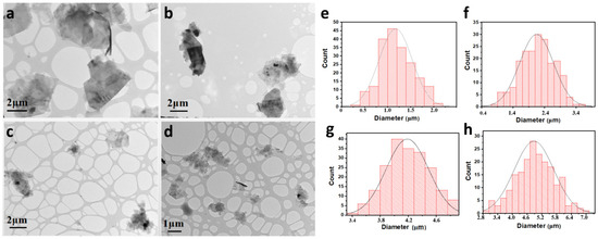 HRTEM image of EG1000 (a), EG3000 (b), EG5000 (c), and EG8000 (d). Size statistics of EG8000 (e), EG5000 (f), EG3000 (g), and EG1000 (h).