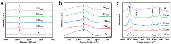 (a,b) Raman spectra of G, EG1000, EG3000, EG5000, and EG8000, respectively. (c) FTIR spectra of G, EG1000, EG3000, EG5000, and EG8000, respectively.