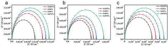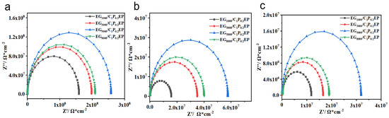 Nyquist plots of EG5000/C1P0.2EP with different EG5000 addition amounts after 7 d (a), 30 d (b), and 60 d (c) of immersion.