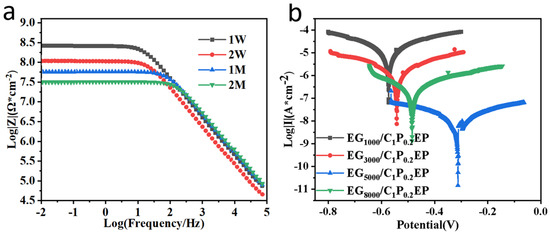 (a) Bode modulus plots of EG5000/C1P0.2EP after 7 d, 14 d, 30 d, and 60 d of immersion. (b) The polarization curve of EG1000/C1P0.2EP, EG3000/C1P0.2EP, EG5000/C1P0.2EP and EG8000/C1P0.2EP after 60 d of neutral salt spray test.