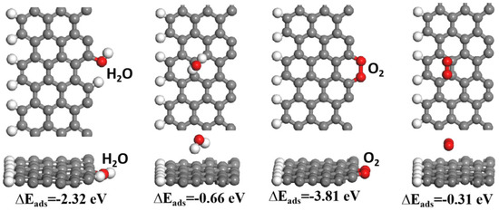 The adsorption structures and energies of O2 and H2O at varying sites on single layers of graphite sheet.