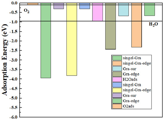 The adsorption energies of O2 and H2O at varying sites on single and double layers of graphite sheet as well as EGx/C1P0.2EP.