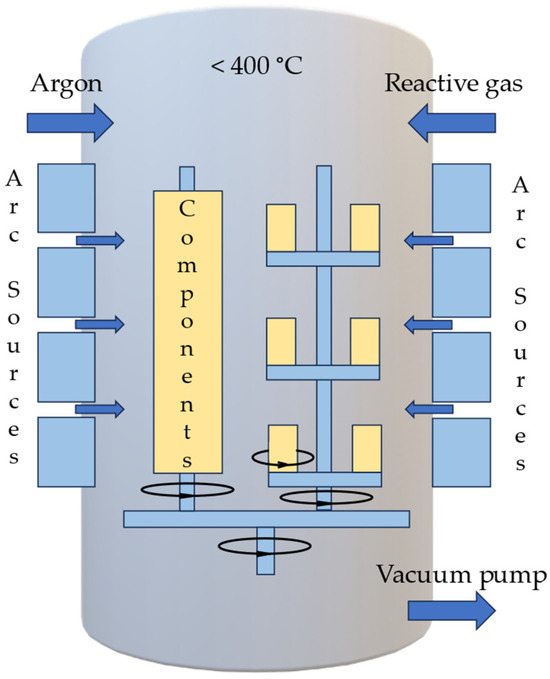 17]. The advantages of CVD include the high deposition rate and coating homogeneity; the disadvantages are the deposition temperature and higher gas pressure than that in PVD. Physical vapour deposition (PVD) involves the crystallisation of vapours of a metal or its compounds on the surface of a component to be coated. In this process, the coating can be administered by several methods, e.g., by magnetron sputter deposition, by arc deposition, by vacuum evaporation, or by ion plating, in which the ion source of the deposited material is a circular target that is placed in a chamber. A vacuum is created in the chamber (10
