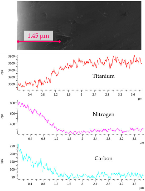 A linear analysis of the elemental distribution of the TiCN coating indicated the presence of all elements assumed in the fabrication process. The deposited layer was approximately 1.5 µm thick and consisted of titanium, carbon, and nitrogen, with the highest concentration of C and N at the surface. At a depth of about 1.2 µm, a marked decrease in counts of these elements was observed. The titanium content increased with depth due to its presence in the Ti6Al4V substrate.