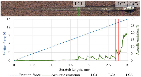 The scratch test results of the TiCN coating deposited onto Ti6Al4V indicated that the deposited layer was characterised by good adhesion to the metallic substrate. A jump in acoustic emission was observed under a critical load of approximately 8.48 N (LC1). Since no chipping of the deposited layer was observed in the optical image, it is assumed that the jump is related to the surface roughness of the coating (presence of peaks and valleys). Increasing the load to 13.4 N (LC2) led to the appearance of the first cracks. These cracks were located inside the formed scratch and were cohesive in nature, i.e., opposite to the direction of movement of the indenter. Increasing the load intensified the formed cracks and their propagation outside the scratch. This resulted in a large amount of chipping along the entire edge of the formed scratch when the indenter was loaded with a force of 13.7 N. Complete coating removal was observed after scratching the TiCN coating with an indenter loaded with a force of 13.9 N (LC3).