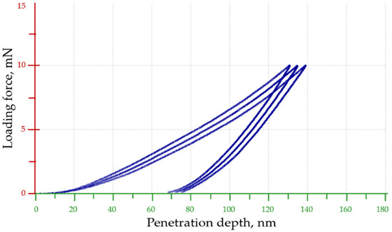Figure 7 presents the load–unload curve as a function of indenter penetration recorded during the hardness test for the reference material and the coating.
