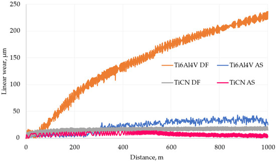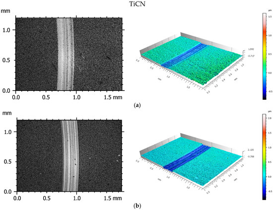 The wear track depth results suggest the high wear resistance of the coatings on Ti6Al4V. The coating’s lowest wear volume and depth values were observed under dry friction and lubrication with artificial saliva. The lubricant increased the wear of Ti6Al4V by 5% and TiCN by 12% due to tribocorrosion between the artificial saliva and the tested surfaces. The wear track depth values revealed that TiCN was not entirely worn away and performed its anti-wear function well.