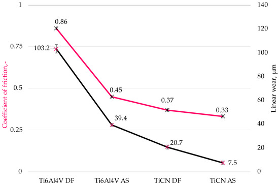32] studied the morphology, surface geometric structure, and tribological properties of TiC, TiAlN, and TiCN coatings deposited onto a Ti6Al4V titanium alloy. They performed tribological tests at room temperature under dry friction using different loads. The results of these tests indicated that the TiCN and AlTiN coatings had a lower coefficient of friction than the TiN coating and that the deposition of all the coatings under analysis contributed to an increase in the Ti6Al4V wear resistance. In addition, the authors analysed the wear tracks and observed adhesive, abrasive, and oxidative wear mechanisms on the surface of the coatings.