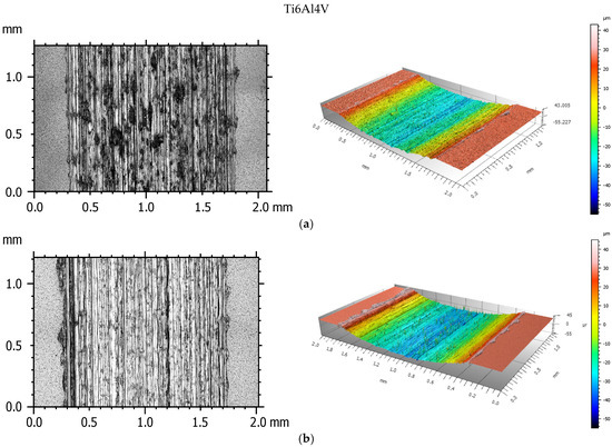 The results of the microscopic observations after the tribological tests indicated that the height parameters were variable depending on the friction conditions and the nature of the surface layer. The highest peaks and valleys were observed on the Ti6Al4V titanium alloy for samples subjected to dry friction and friction with artificial saliva lubrication. The optical and 3D axonometric image analysis showed that micro-cutting/ploughing wear was the dominant wear mechanism. Still, in the case of the coating, wear was significantly lower.