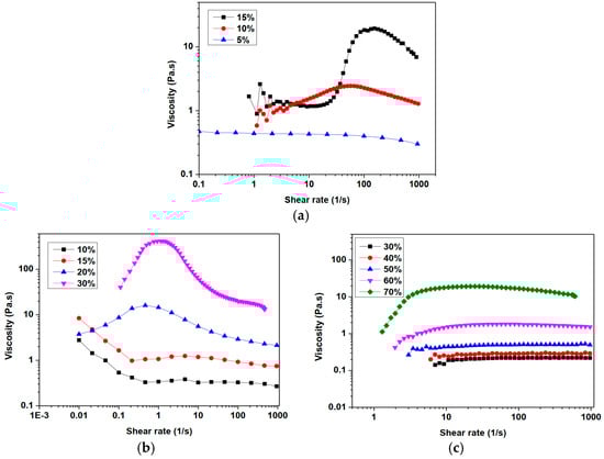 Jiang et al. [49] employed steady-state and dynamic rheological methods to investigate the rheological behavior of poly(methyl methacrylate) (PMMA) particle suspensions in glycerol-water mixtures. The viscosity–shear rate curves for suspensions with different PMMA volume fractions are depicted in Figure 6, with PMMA particle sizes at 14 μm. It was observed that some suspensions exhibited pronounced shear-thickening effects. The variation of viscosity with glycerol volume fraction and glycerol–water ratio was discussed. The influence of volume fraction can be qualitatively explained by a clustering mechanism, attributed to the transient hydrodynamic clustering effect. Furthermore, the impact of interactions between glycerol–water mixtures and PMMA particles on shear thickening was investigated by varying the ratio of glycerol to water.