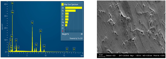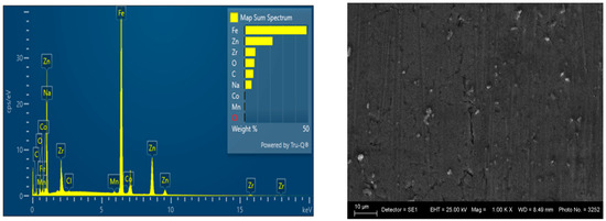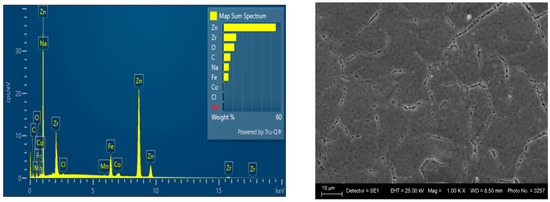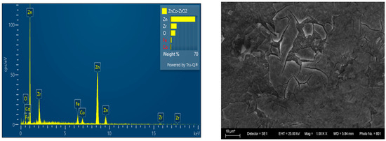 The films’ morphologies and chemical compositions were studied by means of SEM/EDX analyses. The SEM photograph of the sample ZCZ 1 reveals a relatively smooth surface without any visible defects, such as cracks and pores (Figure 3). A great quantity of iron was registered by EDX analysis. Additional peaks corresponding to Zn and Co (originating from the Zn-Co alloy) and Zr, O, C (originating from the oxide film) have also been registered. The increase in the sublayer thicknesses up to 5 µm leads to some morphology and composition changes. Additional small visible cracks are observable (Figure 4). The peak intensity corresponding to iron decreases significantly, while that of Zn increases. In the SEM image of ZCZ 10 coatings, some zones having deeper cracks and various shapes are clearly visible (Figure 5). The samples are composed of the three basic components, which originate from the Zn-Co sublayer and ZrO2 top layer.