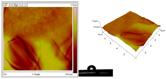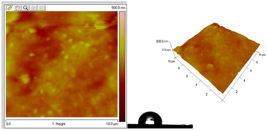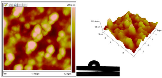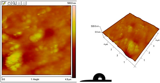 Roughness analysis was carried out using a NanoScopeV (Nanoscope software, Bruker Ltd., Germany, Cantilever force—40 N/m; at scanning rate—1 Hz) atomic force microscope. The arithmetic average of the absolute values of the surface height deviations, i.e., Ra, gives the average roughness parameter, using the mean plane. The hydrophobicity of the surfaces of the bi-layers was estimated by water contact angles (WCAs), using a Ramé-Hart automated goniometer model 290 with DROP image advanced v2.4 (Succasunna, NJ, USA) at ambient temperature. Ten consecutive drops (within the range of 2–5 μL), positioned in random locations of the samples, were applied to measure WCA values.