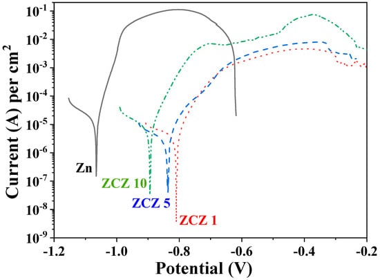 According to the data from Figure 15, the zinc anodic curve passes through a maximum potential of about −0.8 V, and thereafter, it decreases until the full dissolution of the coating. In the zone after the corrosion potential, the anodic current gradually increases. In contrast to this, the anodic currents of the ZCZ bi-layers demonstrate a delayed dissolution process in the same zone. Generally, their maximal anodic dissolution values are significantly lower than that of zinc. It is well known that if cathodic coatings are smooth and without any defects, their current density values will be lower in comparison to anodic ones. In addition, the anodic parts of ZCZ curves are relatively longer compared to those of Zn. This observation indicates that these coatings are more resistive; i.e., they will last longer in the case of external anodic polarization.