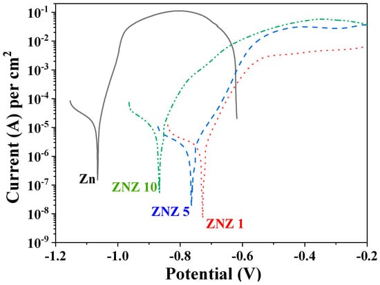 The situation is similar for the case of ZNZ bi-layers and Zn (Figure 16 and Table 4). It can be registered that the corrosion potentials of the investigated samples ZNZ 1 and ZNZ 5 are relatively close, while the same parameter for the ZNZ 10 sample is placed more negatively. Compared to Figure 15, the corrosion current densities are lower except for the case of ZNZ 10 (compared to the information in Table 3). Here, the anodic parts of the ZNZ curves are also characterized by delayed anodic dissolution in the zone directly after the corrosion potential, compared to the ordinary zinc, and in addition, they are longer. This demonstrates clearly that these systems are more durable inside the test medium with chloride ions when external anodic polarization is applied.