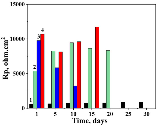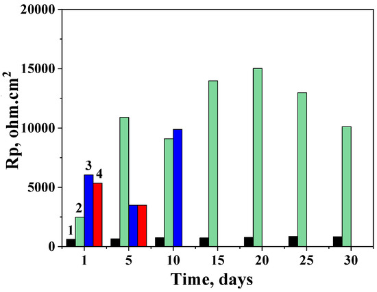 The ordinary zinc specimens demonstrate average Rp values of about 800–850 ohm·cm2 during the 30-day period. During the first days of the test, their polarization resistance is ~780 ohm·cm2, and at the end, it is almost the same. The maximal values of this parameter are obtained after 15 days of immersion.