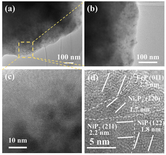 (a–c) TEM images and (d) HR-TEM images of FeP/NiP2/Ni5P4/NiP@NPC nanocomposites.