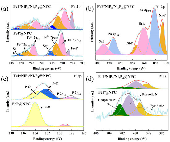 XPS spectra of FeP/NiP2/Ni5P4/NiP@NPC and FeP@NPC: (a) Fe 2p, (b) Ni 2p, (c) P 2p, (d) N 1s.