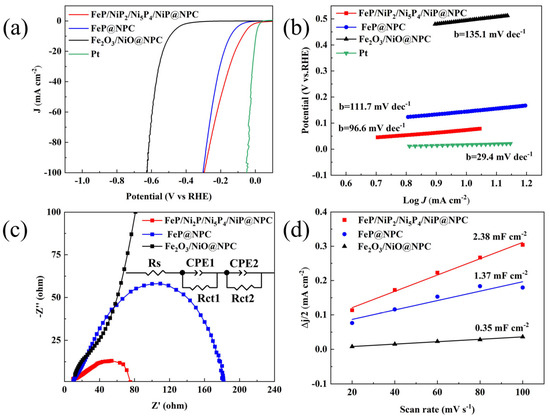 (a) LSV curve; (b) Tafel slope of FeP/NiP2/Ni5P4/NiP@NPC, FeP@NPC, Fe2O3/NiO@NPC, and Pt; (c) Nyquist plot; and (d) capacitive current difference versus scan rate of FeP/NiP2/Ni5P4/NiP@NPC, FeP@NPC, and Fe2O3/NiO@NPC in 0.5 M H2SO4.