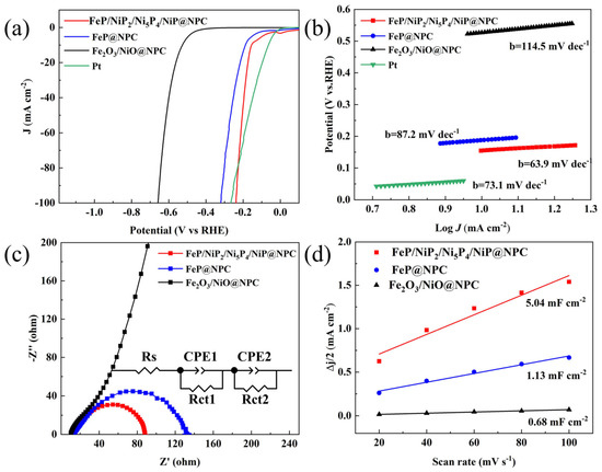 (a) LSV curve; (b) Tafel slope of FeP/NiP2/Ni5P4/NiP@NPC, FeP@NPC, Fe2O3/NiO@NPC, and Pt; (c) Nyquist plot; and (d) capacitive current difference versus scan rate of FeP/NiP2/Ni5P4/NiP@NPC, FeP@NPC, and Fe2O3/NiO@NPC in 1.0 M KOH.