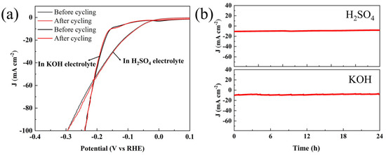 All electrochemical measurements were assessed through a three-electrode system on the CHI 650E electrochemical workstation. The Pt sheet was applied as the counter electrode and the Ag/AgCl electrode was applied as the reference electrode. The working electrodes were prepared as follows: 5 mg of the prepared catalyst was added to 250 µL ethanol and 50 µL Nafion 117 solution (5 wt%) after ultrasonication for 5 min; then, 1.5 mg carbon black was added to the slurry mentioned above, and after 15 min of ultrasonication in an ice water bath, the prepared slurry was dropped on the glassy carbon electrode and left in the air to dry. All of the potentials reported in this article were converted using the Nernst equation: E(RHE) = E(Ag/AgCl) + 0.059 pH + 0.198 V. The linear sweep voltammetry (LSV) was obtained through the scan rate of 5 mV s−1, and the electrochemical impedance spectroscopy (EIS) was characterized under the voltage of 83 mV and 158 mV in acid and alkaline electrolytes, respectively. The electrochemical active surface area (ECSA) was analyzed through the electrochemical double-layer capacitance (Cdl), and the cyclic voltammetry (CV) was characterized under different scan rates from 20 mV s−1 to 100 mV s−1. The stability test was applied through the comparison of LSV curves before and after 1000 CV cycles, as well as the chronopotentiometry test under the overpotential of 75 and 155 mV in the acid and alkaline electrolytes.