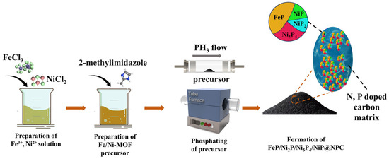 Metal–organic frameworks (MOFs) containing organic ligands find extensive use in producing N-doped carbon materials to expose more active sites. They also serve as conducting substrates that accelerate electron transfer in catalysts [16,17]. Additionally, the N-doped carbon matrix offers protection to transition metal phosphide (TMP) nanoparticles, preventing aggregation during reactions [18,19]. However, it is noteworthy that while the MOF-templated method has been predominantly used for producing monometallic or bimetallic phosphides, reports on facile synthesis methods for multi-metallic phosphides are scarce [20,21].
