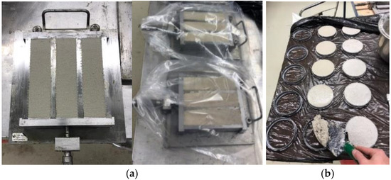 Tests were conducted on prismatic and circular specimens to determine different properties of the mortars in line with EN 1015-11 [18] and ISO 12572 [19] standards (Figure 1). These specimens were hardened in moulds made of non-absorbent material, which prevents the absorption of water constituents of the mortar, as indicated in the standards. Therefore, they are considered a “reference” throughout the experimental campaign.