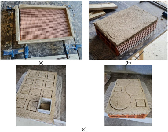 In Figure 2a, the preparation of the hollow ceramic brick substrate is shown. First, the mortar was applied manually on the substrate with a trowel (Figure 2b). Then, the specimens were marked for later detachment using square moulds measuring 40 mm × 40 mm and circular ones with 100 mm diameter (Figure 2c).