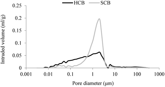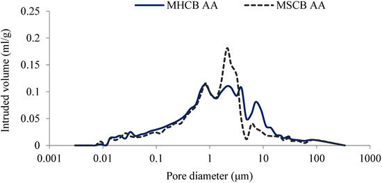 Figure 3 and Figure 4 depict the variation in mercury intrusion volume as a function of the pore diameter obtained in the MIP test for each substrate. Table 3 indicates the total volume of intruded mercury and the average pore diameter.