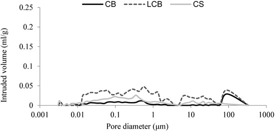 The pore distribution data, represented through mercury intrusion porosimetry (MIP), is graphically illustrated in Figure 3 and Figure 4. Moreover, Table 3 presents a meticulous compilation of numerical MIP results for detailed analysis. Notably, CS emerges as the substrate with the lowest open porosity despite displaying a pore distribution closely resembling CB. Conversely, CB and LCB substrates display a greater abundance of pores exceeding 10 μm compared to their counterparts.
