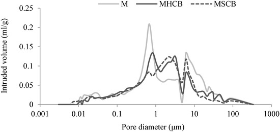Variation in pore diameter after 28 days for M, MHCB, and MSCB.