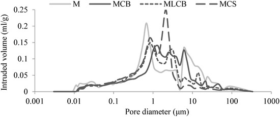 As mentioned, the mortars subjected to accelerated ageing were tested according to standard EN 1015-21 [20]. Figure 12 and Figure 13 show the MIP test results, and Table 5 shows the total intruded volume and average pore diameter.