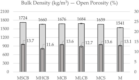 Bulk density and open porosity after 28 days for M, MCB, MLCB, MCS, MSCB, and MHCB.