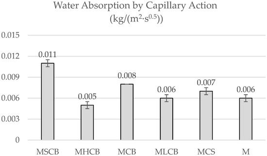 Water absorption by capillary action after 28 days for M, MCB, MLCB, MCS, MSCB, and MHCB.
