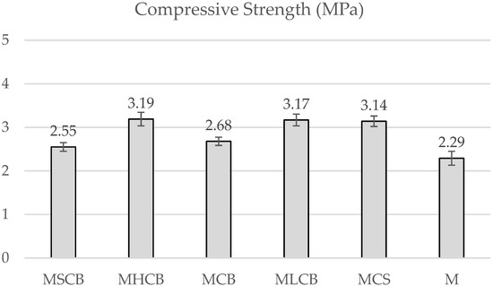 Compressive strength after 28 days for M, MCB, MLCB, MCS, MSCB, and MHCB.
