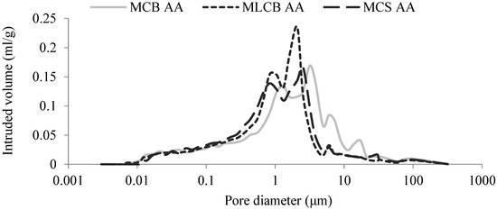 Variation in pore diameter after accelerated ageing for MCB AA, MLCB AA, and MCS AA.