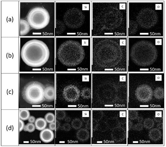 The electron microscopy images (TEM) and the EDS results for the HSNPs are shown in Figure 1. The PAA emulsion size was determined using dynamic light scattering (DLS) via a nano sizer. The measurement result of the average PAA emulsion size was 120.9 nm, while the EDS silicon distribution results revealed that the inner diameter of the silica ranged from 118 to 120 nm, which is consistent with the PAA emulsion particle size. These findings suggest that a silica layer forms on the surface of the PAA droplet. For the changes of PAA seen in the particles in Figure 1a, the PAA in the hollow particles did not exist inside the particle in the form of particle nuclei but were attached to the inner wall of the silica shell, so that the hollow particles formed the double-layer composite structure of SiO2-PAA. At the same time, carbon was observed on the outside layer of the particle. This was caused by the residual PAA on the particle surface and also by the impurities that had been adsorbed on the particle surface. When the particles were washed, parts of the PAA layer became thinner, indicating that some PAA had been removed; as shown in Figure 1b–d, in the particles that were roasted, the PAA layer completely disappeared, and the particles exhibited a single-layer structure in the silica shell. At the same time, as shown by the EDS results for the distribution of the C and Si elements, the particles had a silica shell layer and an inner shell layer of PAA, giving the particles a double-layer hollow composite structure. When the particles were roasted, the inner PAA layer disappeared, making the particles appear as a single layer of silica. The analysis results also showed that with the increased washing times, while the proportion of the C element decreased, the proportion of Si increased. This result is the same as that shown in the TEM image. At the same time, there was a distribution of C elements on the outer part of the particle’s silica shell. It is suggested that particle washing was caused by the PAA molecular chains that were discharged from the particles and were partly wrapped in the silica shell; for the no-PAA hollow silica particles, this may have been caused by particles adsorbing a small number of organic impurities from the air.