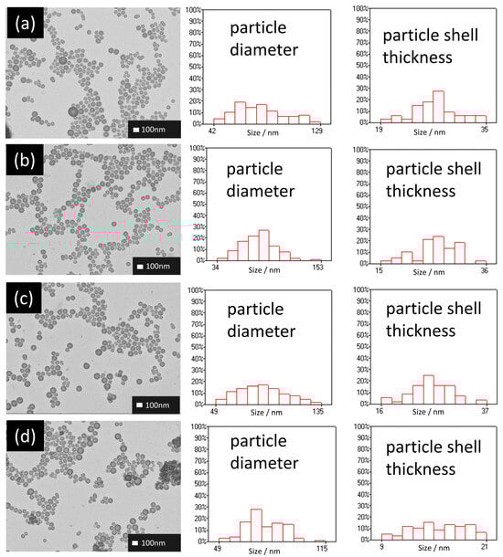 Statistical results of composite particle diameter and the shell thickness distribution of composite hollow particles ((a) = not washed, (b) = washed once, (c) = washed twice, (d) = PAA completely removed).