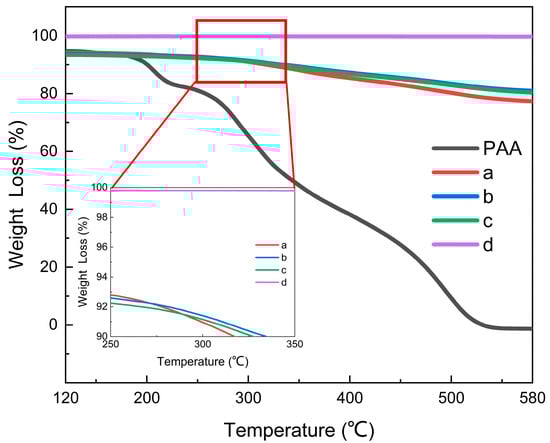 To characterize the content of the PAA inside the composite particles and the influence of the change of the PAA on the heat resistance of the particles, the composite particles underwent thermogravimetric (TG) analysis. Figure 3 shows the thermal analysis results of the hollow particles with different PAA residues. From the PAA thermal loss curve, we can identify three decomposition regions, which are at 160 °C, 224 °C, and 269 °C. The thermal degradation of the PAA causes these three separate decomposition regions. The first region is from a minor decarboxylation reaction []. The second decomposition stage is mainly caused by anhydride formation. The third decomposition region is from the thermal degradation of the polyacrylic anhydride []. It can also be seen that the decomposition temperature of the PAA composite particles was significantly higher than for pure PAA, indicating that the silica shell delayed the pyrolysis of PAA and the thermal stability was significantly improved.