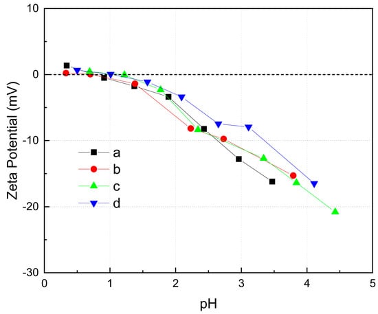 Zeta potential titration results for the composite particles ((a) = not washed, (b) = washed once, (c) = washed twice, (d) = PAA completely removed).
