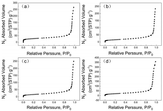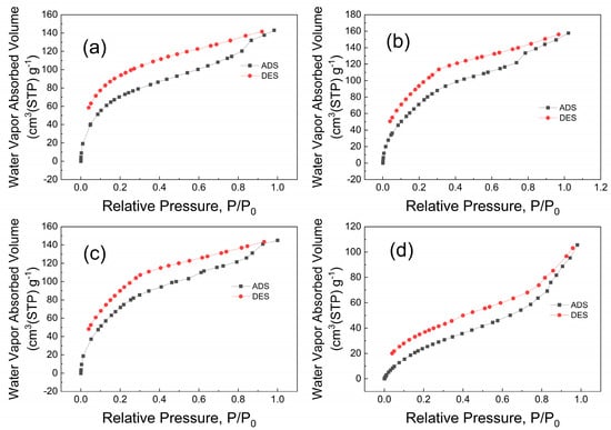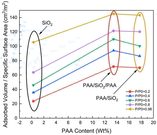 To evaluate the influence of the PAA addition’s content on the water adsorption properties of the composite particles, the comparison results of the water vapor adsorption properties of particles with different PAA contents are shown in Figure 9.