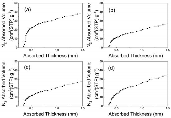 The t-plot curves under the nitrogen adsorption of composite hollow particles with different PAA contents ((a) = not washed, (b) = washed once, (c) = washed twice, (d) = PAA completely removed).