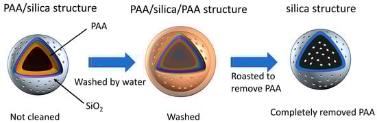 According to the structural changes of the silica nanoparticles, the change can be divided into three stages: the double-layer structure of the PAA/silica of the composite particles when they are not washed, the three-layer composite structure of PAA/silica/PAA after washing, and the single-layer silica structure with the PAA completely removed by roasting.