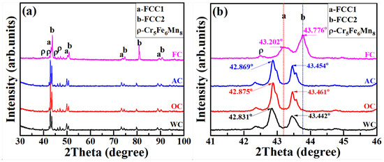 As shown in Figure 1b, the main peaks of the FCC1 and FCC2 phases in the heat-treated alloy shifted to small angles with the increasing cooling rate. At low cooling rates (FC state), each element diffused sufficiently to form FCC1, FCC2, and ρ phases. The main solid-solution element of the FCC1 phase was Cr-Fe, the main solid-solution element of the FCC2 phase was Cu-Ni, and the main component of the ρ phase was Cr-Fe-Mn. At high cooling rates (AC, OC, and WC states), both the FCC2 phase and the ρ phase content decreased, indicating that alloying elements in the FCC2 phase and ρ phase diffused with each other, leading to an increase in the FCC1 phase content. Among these alloying elements, the atomic radii in descending order were Mn>Cu>Cr>Ni>Fe. The Mn element caused by the decomposition of the ρ phase diffused into FCC1 and FCC2, resulting in an increase in their lattice constants. Therefore, the main peaks of FCC1 and FCC2 phases in XRD shifted towards a small angle direction. Yao et al. [22] observed a similar phenomenon in their study of the CoCrFeMnNi-Mo5C0.5 alloy: the FCC phase diffraction peaks also shifted to small angles with an increase in the cooling rate.