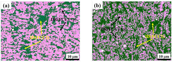 CuCrFeMnNi HEA powder consists of a metastable FCC main phase and a BCC secondary phase [18,19]. In the sintered state, these phases transform into the FCC1 main phase, the FCC2 secondary phase, and a ρ phase with relative contents of 40.2%, 31.8%, and 28.0%, respectively. When the furnace was cold, the relative content of the FCC1 phase decreased to 27.4%, that of the FCC2 phase increased to 52.2%, and that of the ρ phase decreased to 20.4%. With an increase in cooling rate, the relative content of the FCC1 phase increased from 27.4% to 51.3%, that of the FCC2 phase decreased from 52.2% to 32.3%, and that of the ρ phase initially decreased from 20.4% to 14.8%, and then slightly increased to 16.4%. This finding indicates that during high-temperature heat treatment, the precipitation and decomposition of these phases occurs dynamically [18]. In particular, the high-melting-point phases preferentially precipitate during cooling [27]. The ρ phase is a Cr5Fe6Mn8 intermetallic compound with a tetragonal crystal structure and is known for its relatively high melting point. Its primary constituents are Cr, Fe, and Mn, and it exhibits high microhardness (1273 HV). In XRD, it is primarily observed in the range of 2θ = 41° to 49° [15]. FCC1 is an (Fe, Cr, Mn)-rich phase, with a lower melting point than the ρ phase, and FCC2 is a (Cu, Ni, Mn)-rich phase, with the lowest melting point. The differing lattice constants of the two phases resulted in a double-peak phenomenon in the XRD patterns. The CuCrFeMnNi sintered alloy underwent isothermal aging and four different cooling methods. The phases comprised two types of FCC phase (FCC1 and FCC2) plus a minor amount of the Cr5Fe6Mn8 phase, closely resembling previous research findings.