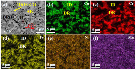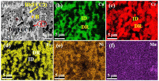 SEM map scanning results of the CuCrFeMnNi HEA after FC state: (a) backscatter image, (b) Cu, (c) Cr, (d) Fe, (e) Ni, and (f) Mn.