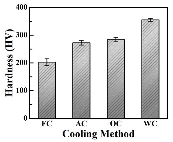 Figure 7 illustrates the microhardness of the CuCrFeMnNi HEA under the four cooling methods. The FC alloy yielded a microhardness of approximately 202.6 HV, which then gradually increased with the cooling rate. WC resulted in the highest microhardness of 355 HV. Zhao et al. [28] found that in the sintered state, the microstructure of CuCrFeMnNi HEA comprised an FCC1 phase rich in Cr-Fe, an FCC2 phase rich in Cu, and a ρ phase. Its microhardness reached 543 HV. However, the present study found that after heat treatment at 800 °C for 12 h, the phase structure remained unchanged but the main phase transition was from FCC1 to FCC2, with a significant reduction in the relative content of the ρ phase. Zhao et al. [28] also reported that the FCC1 phase was harder than the FCC2 phase, the ρ phase also had high hardness, and their decreased relative content primarily led to a reduction in the alloy’s microhardness. With an increase in the cooling rate, the alloy’s phase structure shifted from FCC2 to FCC1, accompanied by a relative increase in the phase content. This phenomenon resulted in an increase in microhardness. Compared with AC- and OC-state alloys, the cooling rate of WC-state alloy was faster, and the relative content of hard phases FCC1 and ρ in the alloy was the highest, so its microhardness was the highest, reaching 355 HV. These results show that the strengthening mechanisms of the WC-state alloy were primarily solid-solution strengthening and second-phase precipitation strengthening.