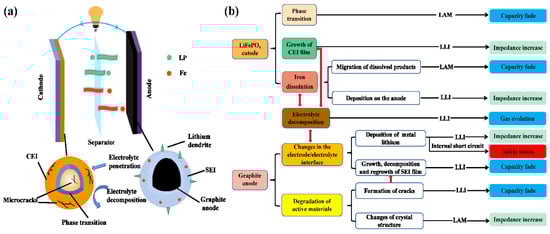 (a) The degradation mechanisms of LiFePO4 batteries; (b) schematic diagram of basic electrochemical reaction occurring in a LiFePO4 battery.