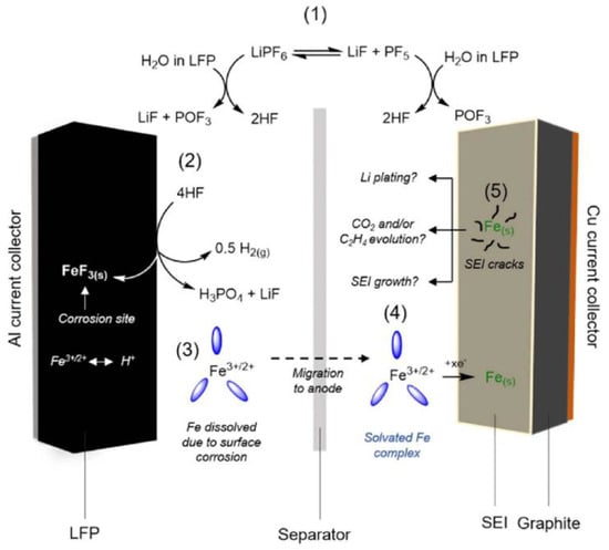 High temperature is the main reason for iron dissolution. At 55 °C, the aged LFP cathode displays that Fe2+ is dissolved from the positive active material and reduced to iron on the surface of the carbon-negative electrode. However, such an effect is not observed for cathodes aged at −20 °C [40]. A schematic representation of an LFP/graphite Li-ion cell and the chemical reactions contributing to cell failure are depicted in Figure 5 [41]. The dissolution of iron and its subsequent influence on the battery can be divided into the following steps: (1) LiPF6 hydrolysis producing HF; (2) HF corrosion on the LFP surface; (3) the solvation of Fe2+; (4) the reduction of solvated Fe2+; and (5) potential impairment to SEI, resulting in SEI thickening and gas evolution. During charging, dissolved Fe2+ migrates to the anode and is reduced to Fe, which is deposited on the anode surface. These iron deposits hinder the Li+ intercalation into the graphite anode, leading to the inaccessibility of the graphite layers [42]. Additionally, charge transfer resistance (Rct) analysis using EIS confirms the obstacle of Li+ intercalation, contributing to capacity fade in cells cycled in Fe-containing electrolytes [43]. Moreover, these deposits accelerate electrolyte decomposition and aggravate surface structural disorder in graphite by catalyzing the reduction of some organic SEI components, resulting in a thicker SEI layer [44]. The loss of active lithium ions leads to a decline in battery capacity [45]. In conclusion, both effects contribute to capacity fade upon cycling, resulting in the loss of lithium inventory at the anode and increased electrode polarization [46].