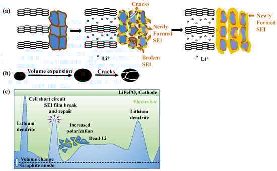 A schematic illustration of degradations at the graphite anode. (a) The formation of an irreversible SEI layer; (b) structural degradation; (c) the growth of lithium dendrites.